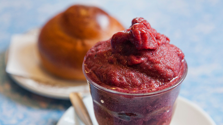 Texturally, granita looks like the contents of a snow ball or a snow cone, but it's much creamier to taste. It's also super easy to make at home once you know the formula. All you need is a liquid base, like espresso, almond milk, or a fruit puree, then a sweetener like sugar or simple syrup. Cover your liquid mixture in a baking dish and place it in the freezer, scraping up the ice crystals that form every 30 minutes or so until the perfect consistency is achieved (it should never fully freeze). The ice crystals stay pleasantly crunchy while not so firm that they won't melt in your mouth for a creamy consistency that's seriously improved by a dollop of whipped cream.